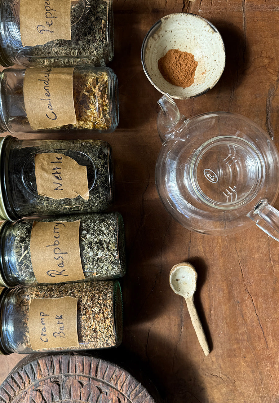 For my bleed I love blends of Cramp Bark, Chamomile, Peppermint, Nettle, Raspberry Leaf, Calendula, Cinnamon. Blends like this ease muscle cramping and bring my body ease / calm.