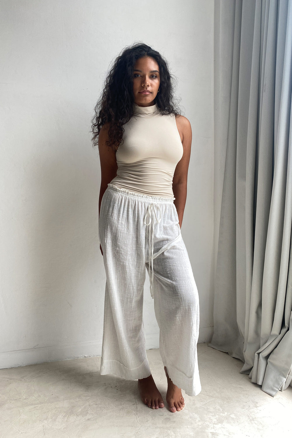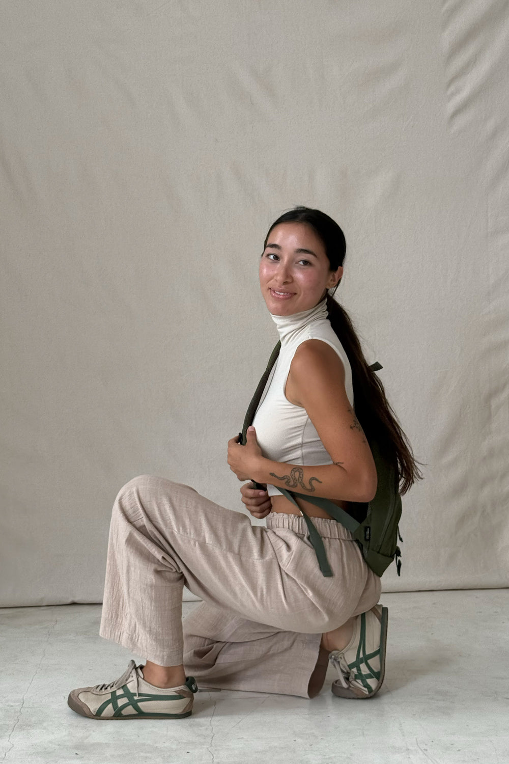 Hitomi shared the importance of creating pieces that wouldn’t anchor her to one aesthetic and would allow her to move through all her different archetypes – so we designed the Ritual Top to honor this need for versatility. It features a modern and flattering high neck top for all of your daily rituals, no matter the season. This piece can be easily styled with every alter ego; pair with the Devotion Pants for a more adventure-ready look, or a low waist skirt for a little romance.