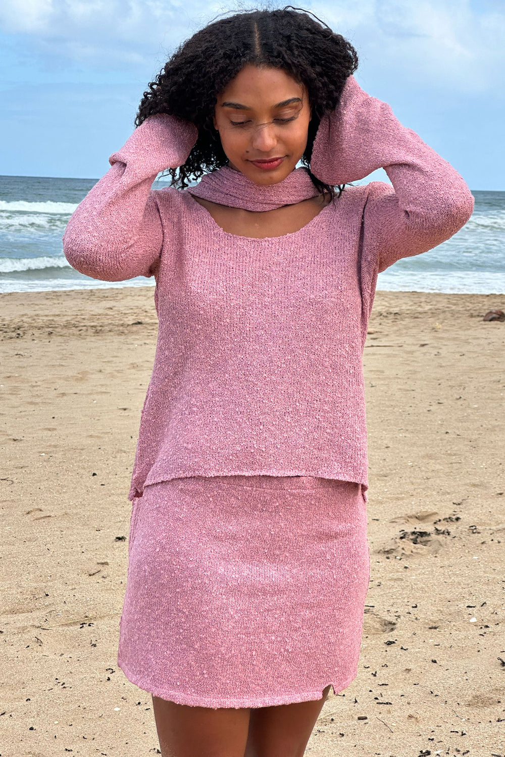 For this knitwear piece, we have hand-blended our gorgeous Cotton Yarn with a touch of leftover acrylic for the softest touch. The feel of the material is completely like our beautiful 100% cotton but we decided to blend it to make the pieces slightly warmer. We don’t use any animal-based fibres in our collections so finding a balance this way for something that will last for years to come.